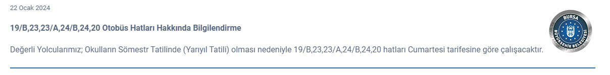 Değerli Yolcularımız; Okulların Sömestr Tatilinde (Yarıyıl Tatili) olması nedeniyle 19/B,23,23/A,24/B,24,20 hatları Cumartesi tarifesine göre çalışacaktır.