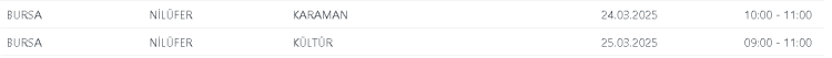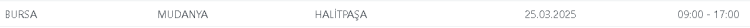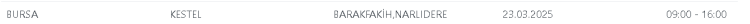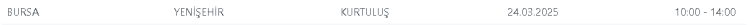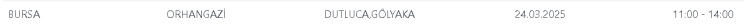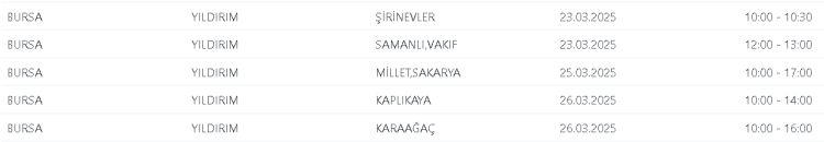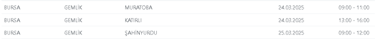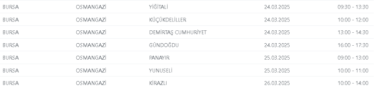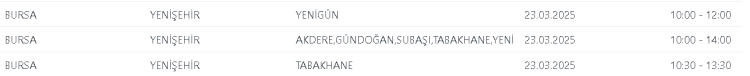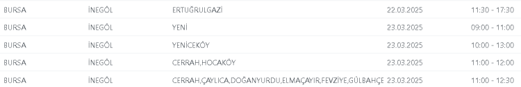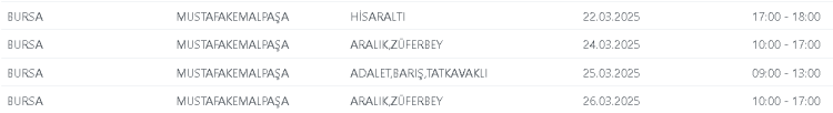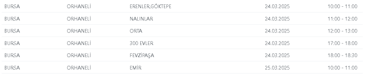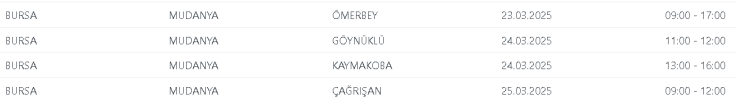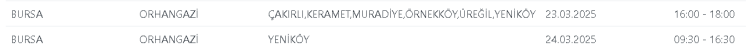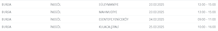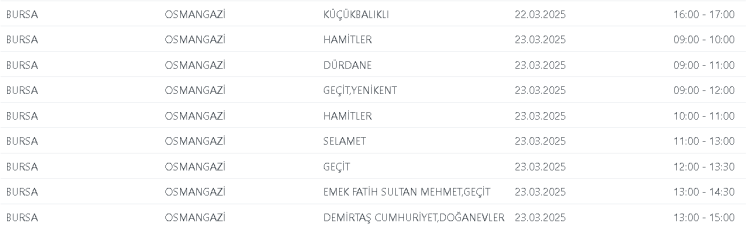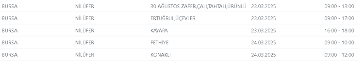 Yapılacak olan kesintiler Bursa'nın Gemlik, Gürsu, İnegöl, İznik, Kestel, Mudanya, Mustafakemalpaşa, Nilüfer, Orhaneli, Orhangazi, Osmangazi, Yenişehir ve Yıldırım ilçelerindeki bazı mahallelerde meydana gelecek.