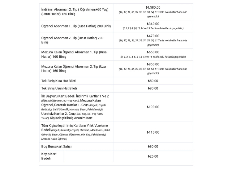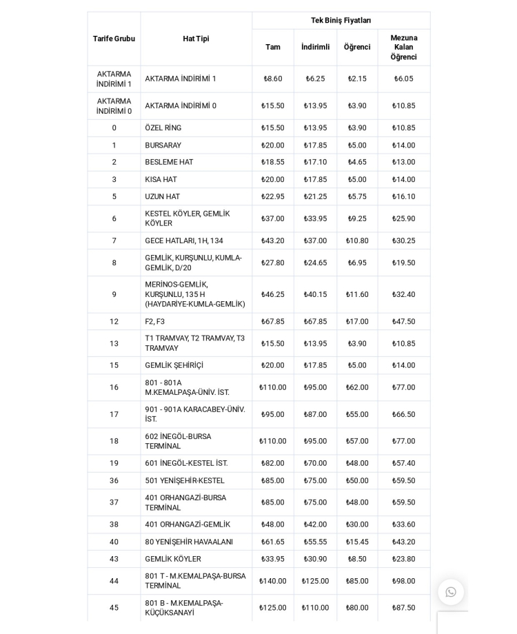 Bursa Büyükşehir Belediyesi'nin ulaşım işletmesi BURULAŞ, zamlı toplu taşıma fiyat tarifesini yayımladı. İşte yeni fiyat tarifesi...