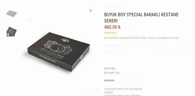 Özel kutularda genellikle gram hesabıyla satılan ürünün 500 gramlık kutudaki kestane şekerinin fiyatı 480 liradan başlıyor. Uygulanan hediye ambalajına ve kutusuna göre fiyatı 500 lirayı aşıyor. Kilogram fiyatı olarak ise 1000 TL'ye yaklaşıyor...