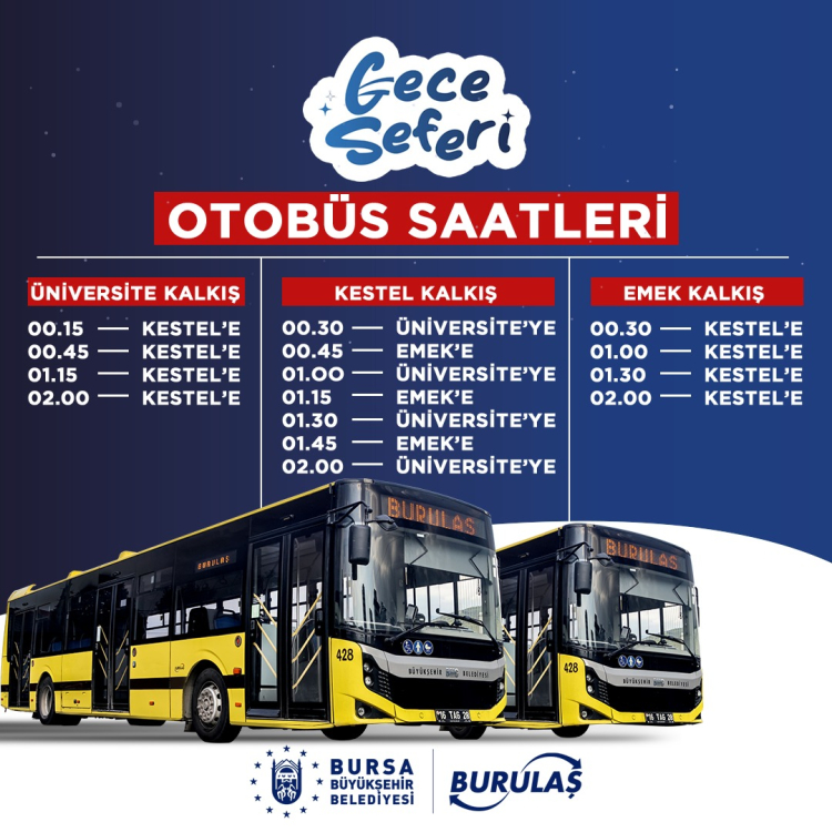 KESTEL'DEN KALKIŞ olmak üzere ÜNİVERSİTE VE EMEK'E yapılacak gece seferi saatleri,