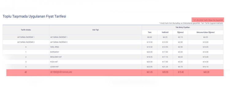 (BURULAŞ'ın 01.08.2024 Tarihi itibari ile geçerli fiyat tarifesinde 80 nolu otobüs de yer alıyor.)