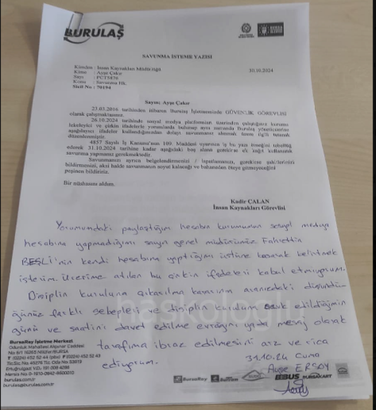"26.10.2024 tarihinde sosyal medya platformları üzerinden çalıştığınız kurumu lekeyici ve çirki ifadelerle yorumlarda bulunup aynı zamanda BURULAŞ yöneticilerine aşağılayıcı ifadeler kullandığınızdan dolayı savunmanız alınmak üzere ilgili tutanak düzenlenmiştir. 4857 Sayılı İş Kanunu'nun 109. Maddesi uyarınca iş bu yazı örneğini tebellüğ ederek 31.10.2024 tarihine kadar aşağıdaki boş alana gerekirse ek kağıt kullanarak savunma yapmanız gerekmektedir. Savunmanızı ayrıca belgelendirmenizi/ispatlamanızı, gerekirse şahitlerinizi, aksi halde savunmanın soyut kalacağı ve bahaneden öteye gitmeyeceğini peşinen bildiririz. "
