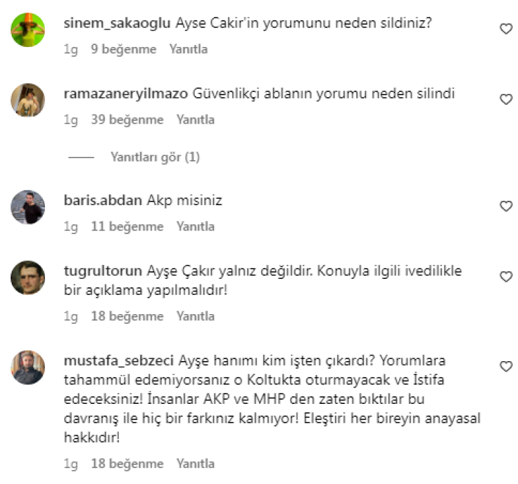 9 yıldır BURULAŞ'ta güvenlik görevlisi olarak çalışan Ayşe Çakır, Beşli'nin paylaşımının altına yorum yazarak sitem etti.