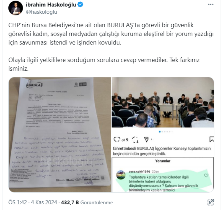 "CHP'nin Bursa Belediyesi'ne ait olan BURULAŞ'ta görevli bir güvenlik görevlisi kadın, sosyal medyadan çalıştığı kuruma eleştirel bir yorum yazdığı için savunması istendi ve işinden kovuldu." diyen Haskoloğlu, olayla ilgili yetkililere sorduğu sorulara cevap alamadığını ifade etti.