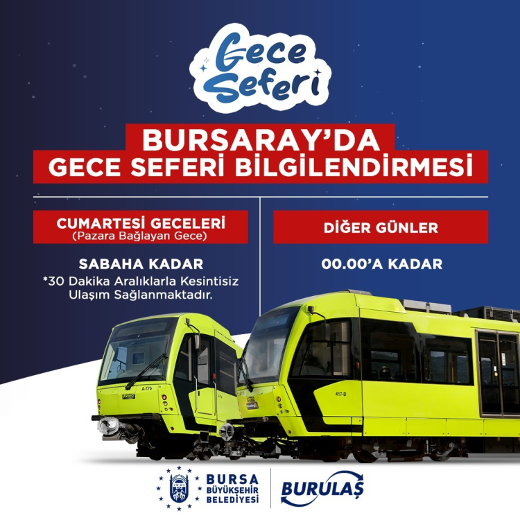 Bursa Büyükşehir Belediyesi'nin ulaşım işletmesi Bursa Ulaşım Toplu Taşıma İşletmeciliği (BURULAŞ), gece seferlerinin başladığı Bursaray saatleriyle ilgili bilgilendirme yayımladı.