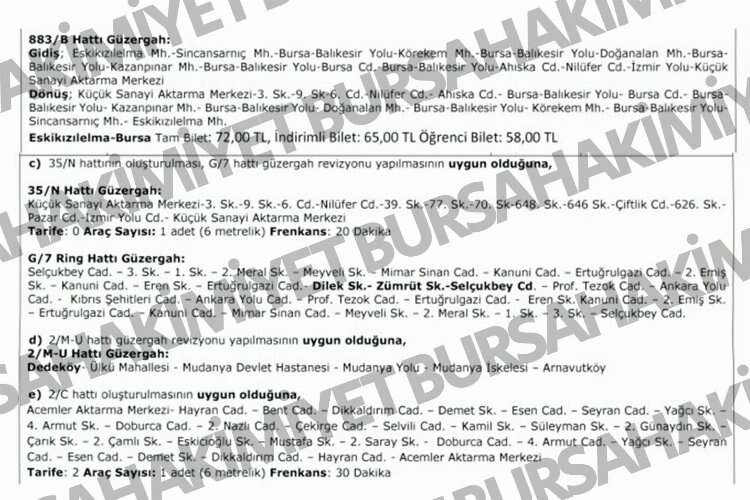 BURULAŞ'ın D/11-B, 2/C ve35/N hattı oluşturulması; D/3, 7/A, G/2, G/3, G/5, G/7, 16/1, 3/MU, B/33-K, D/8, D/11, 2/G-M, 6/F-1, 2/M-U ve 883/B hatlarında güzergah revizyonu yapılması talepleri ele alındı.