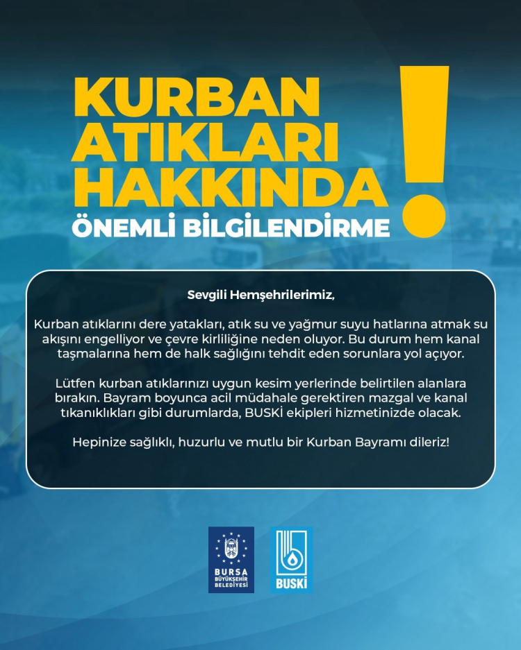 BUSKİ, Bursalıları kurban atıkları konusunda uyardı. Yapılan uyarıda kurban atıklarının dere yatakları, atık su ve yağmur suyu hatlarına atılmaması istendi.