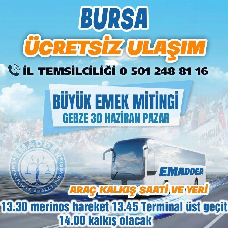 Yayımlanan duyuruda, Büyük Emek mitingi için Bursa temsilciliğinin ücretisiz ulaşım imkanı sağlayacağı belirtildi.