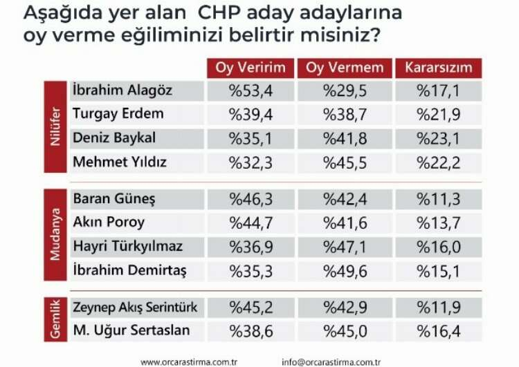 Anket sonuçlarına göre, Bursa'daki Nilüfer, Gemlik ve Mudanya ilçelerini yöneten 3 CHP'li başkan da ankette ilk sırada yer alamadı.