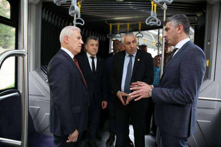 Bursa’yı metrobüs ile tanıştırmaya hazırlanan Bozbey, CHP İnegöl Belediye Başkan Adayı Ali Doğan ve Ulaşım Group Şirketler Genel Müdürü Şaban Baka ile birlikte 3 kabinden oluşan 25 metre uzunluğunda 281 yolcu kapasiteli metrobüsü gezerek incelemelerde bulundu ve ön siparişini verdi.