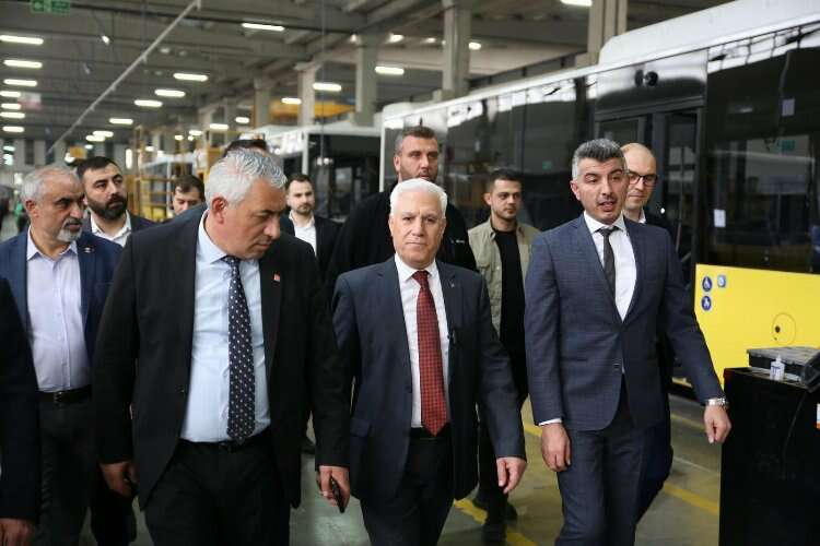 Ardından montaj ve üretim alanını gezen Bozbey, düşük alt yapı maliyetiyle daha çok yolcuya hizmet verme amacı güden metrobüsün yapım aşaması hakkında bilgi aldı.
