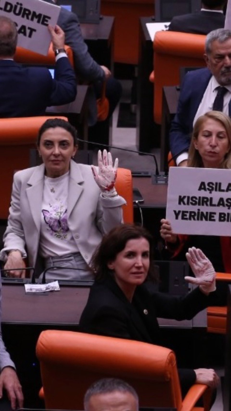 CHP Bursa Milletvekili Nurhayat Altaca Kayışoğlu, Meclis Genel Kurulu’nda görüşülen 'Hayvanları Koruma Kanunu'nda Değişiklik Yapılmasına Dair Kanun Teklifi'ni 'Katliama dur de' yazılı kırmızı boyalı eldivenlerle protesto etti.