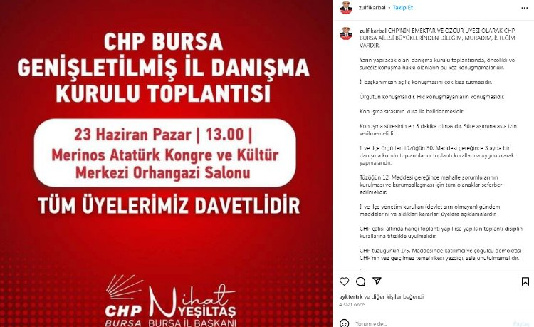 Yarın yapılacak toplantı öncesi sosyal medya hesabından paylaşım yapan Bal, öncelikli ve süresiz konuşma hakkı olanların bu kez konuşmamalarını, CHP Bursa İl Başkanı Nihat Yeşiltaş'ın açılış konuşmasını çok kısa tutmasını ve hiç konuşmayanların, örgütün konuşmasını istedi.