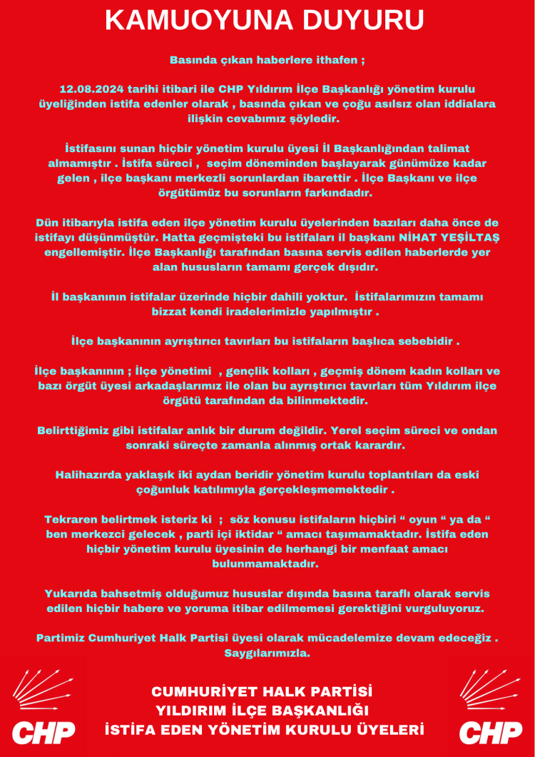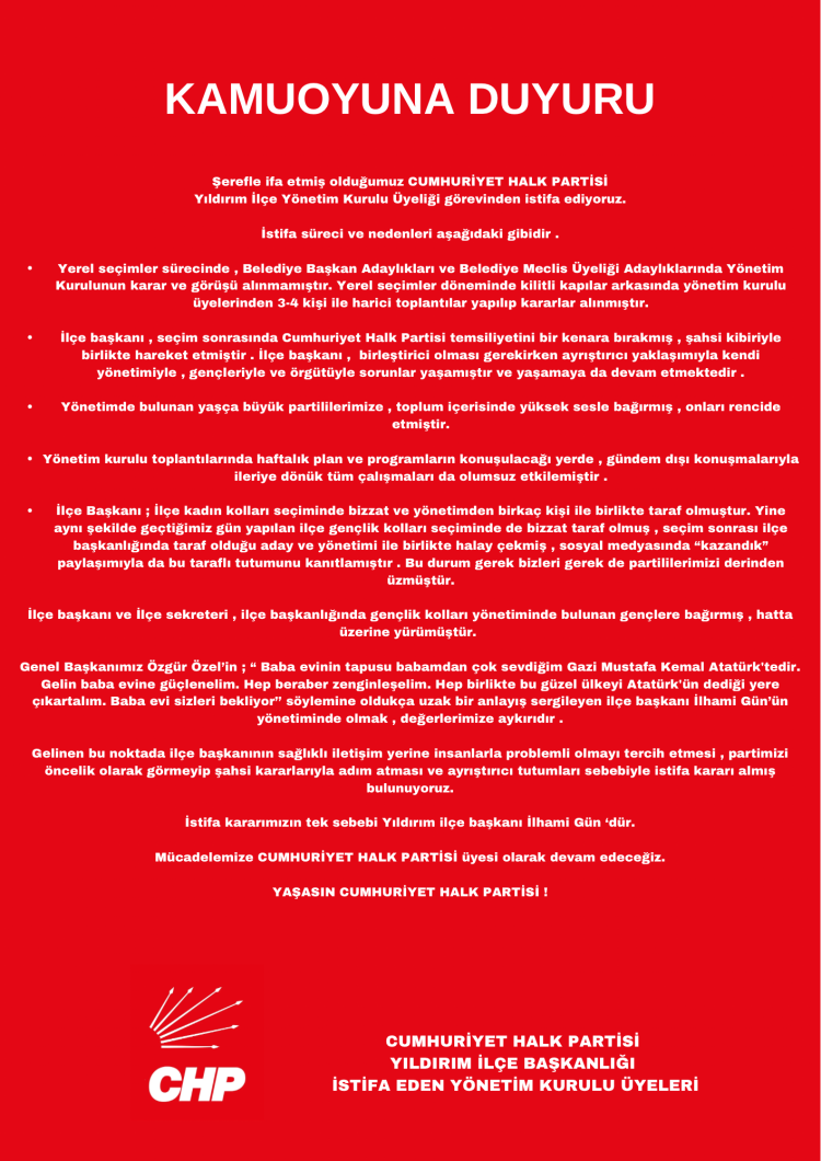 İşte istifa eden CHP Yıldırım İlçe Başkanlığı Yönetim Kurulu üyelerinin açıklamaları: