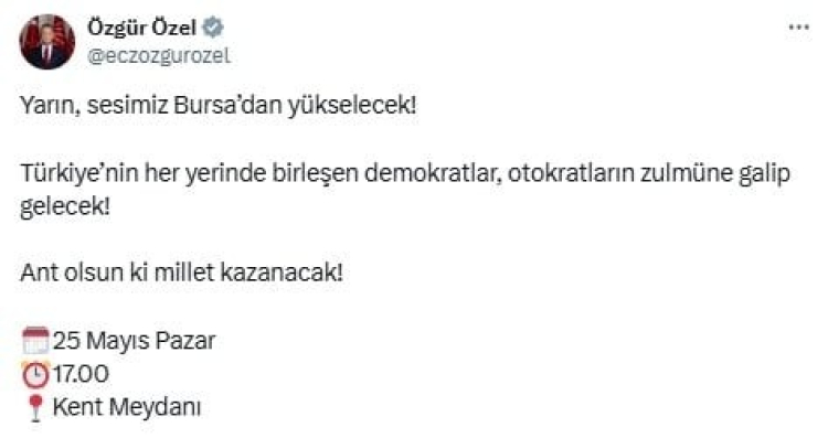 Özel, "Yarın, sesimiz Bursa’dan yükselecek! Türkiye’nin her yerinde birleşen demokratlar, otokratların zulmüne galip gelecek! Ant olsun ki millet kazanacak!" ifadelerini kullandı.