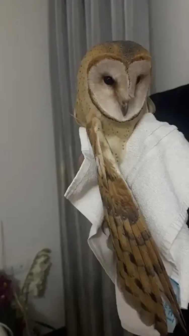 Görüntülerde havluyla yakalanan peçeli baykuşun, sakin bir şekilde etrafa baktığı görüldü. Baykuşun cam balkondan dışarı salındığı anlar da görüntüye yansıdı.