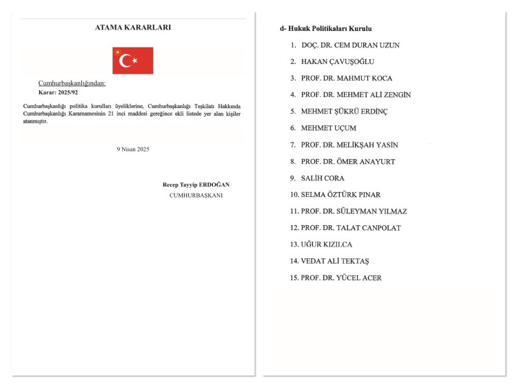 65. Hükümet Başbakan Yardımcısı, 24. 25. 26. ve 27. Dönem Bursa Milletvekili Hakan Çavuşoğlu, Türkiye Cumhuriyeti Cumhurbaşkanlığı Hukuk Politikaları Kurulu Üyeliğine atandı.