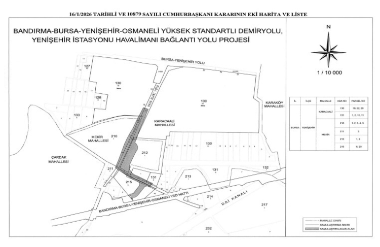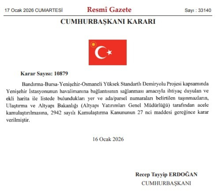 Cumhurbaşkanı Recep Tayyip Erdoğan'ın imzasıyla Bandırma-Bursa-Yenişehir-Osmaneli Yüksek Standartlı Demir Yolu Projesi kapsamında Bursa'nın Yenişehir ilçesindeki bazı taşınmazların acele kamulaştırılması kararlaştırıldı.