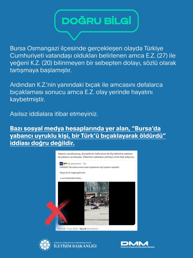 Türkiye Cumhuriyeti Cumhurbaşkanlığı İletişim Başkanlığı'na bağlı Dezenformasyonla Mücadele Merkezi (DMM), bazı sosyal medya hesaplarında yer alan, “Bursa'da yabancı uyruklu kişi, bir Türk'ü bıçaklayarak öldürdü” iddiasının asılsız olduğunu açıkladı.
