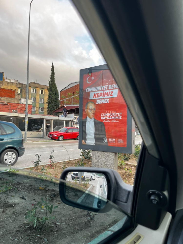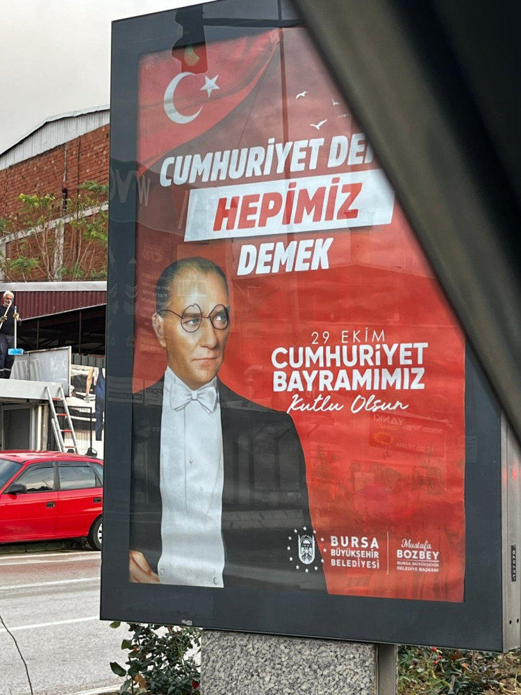 Bursa’da 29 Ekim Cumhuriyet Bayramı nedeniyle asılan afişte yer alan Atatürk'ün fotoğrafına gözlük çizilmesi tepki çekti.