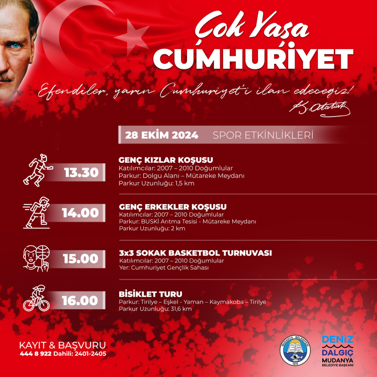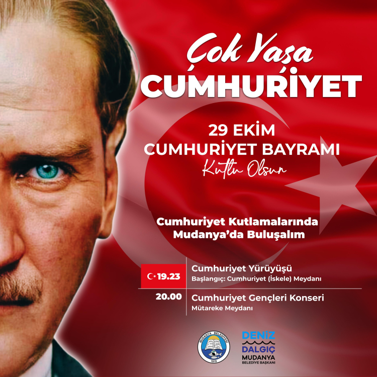 Türkiye Cumhuriyeti’nin kuruluş temellerinin atıldığı anlaşmaya ev sahipliği yapan Mudanya’da, 29 Ekim Cumhuriyet Bayramı coşkuyla kutlanacak. Kutlamalar, 28 Ekim saat 13.00’te Atatürk Anıtı’na çelenk sunma töreniyle başlayacak. Aynı gün Mudanya Belediyesi tarafından düzenlenen spor etkinliklerinde genç kızlar ve genç erkekler kategorilerinde Cumhuriyet Koşusu, 3x3 Sokak Basketbolu ve bisiklet turu yapılacak. 28 Ekim akşamı Mütareke Meydanı’nda yazar Yalın Alpay, “Cumhuriyetin Tasarımı” başlıklı söyleşiyle Mudanyalılarla buluşacak.