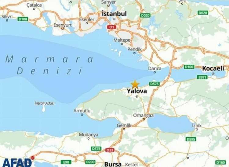 AFAD'dan aktarılan bilgiye göre; Marmara Denizi Yalova açıklarında dün saat 09:21'de 3.5 büyüklüğünde deprem meydana geldi. Depremin derinliği 9,71 km olarak açıklandı. İstanbul, Bursa ve çevre illerde hissedildi.