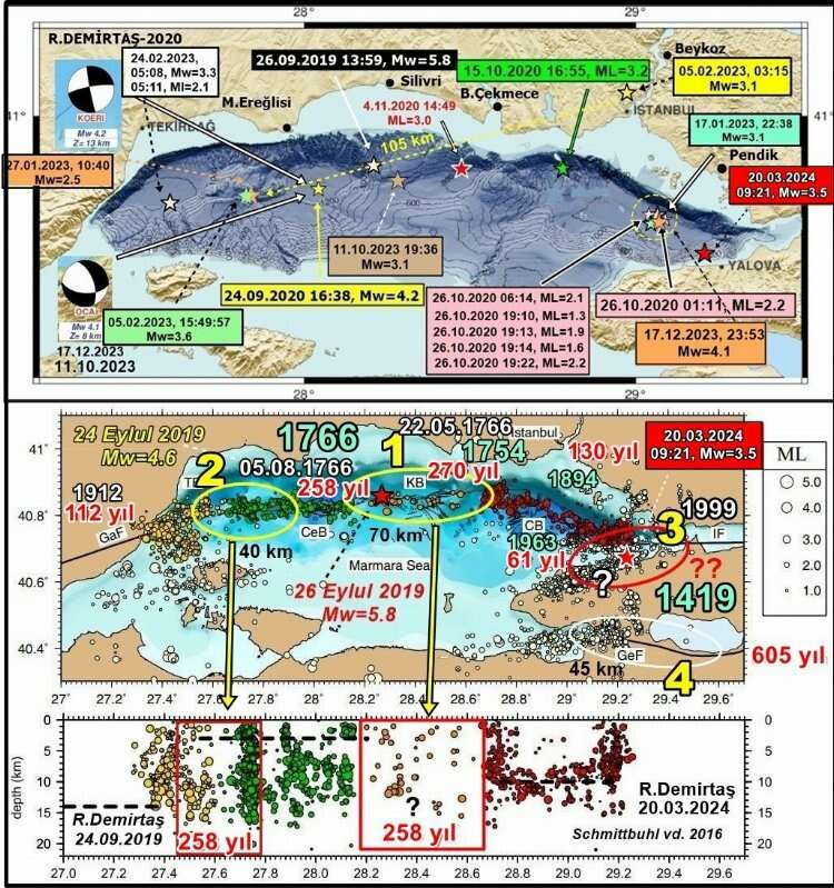 Marmara Denizi, Yalova açıklarında, Çınarçık çukurluğunun GD kenarında; 61 yıl önce olmuş 18 Eylül 1963 depremini (M=6.4) üreten Çınarcık fayının doğu ucunda: 20.03.2024, 09:21 Mw=3.5 büyüklüğünde bir deprem oldu. Bu kesim ve Gemlik Körfezi 2008 yılından bu yana oldukça aktif.