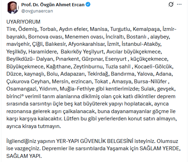 Yer bilimci Prof. Dr. Övgün Ahmet Ercan, sosyal medya hesabından yaptığı paylaşımda, Türkiye'nin farklı bölgelerinde sulak ve gevşek zemine inşa edilen çok katlı yapıların deprem sırasında ciddi tehlike yaratabileceğini belirterek vatandaşları uyardı.