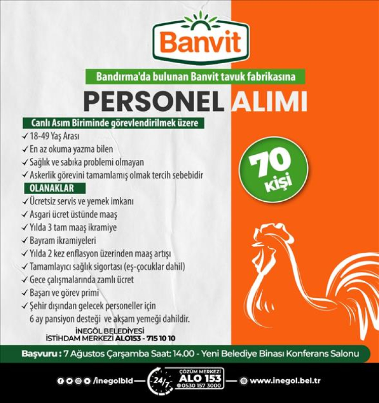 İnegöl Belediyesi İstihdam Merkezinden yapılan açıklamada, Banvit firmasında çalışmak üzere personel alımı yapılacağı duyuruldu. Açıklamada şu ifadelere yer verildi: “İstihdam Merkezimizle iş birliği yapan Banvit firması, Bandırma’da bulunan tavuk fabrikasında çalışacak canlı asım biriminde görevlendirilmek üzere personel alımı yapacak. Aranan genel şartlarda 18-49 yaş arası, en az okuma yazma bilen, sağlık ve sabıka problemi olmayan ve askerlik görevini tamamlamış olmak tercih sebebi olacak. Firma farklı şehirlerden gelecek personeller için çeşitli imkanlar da sunuyor. Ücretsiz servis ve yemek ikramı, asgari ücret üzerinde maaş, yılda 3 tam maaş ikramiye, bayram ikramiyeleri, yılda 2 kez enflasyon üzerinde maaş artışı, tamamlayıcı sağlık sigortası, gece çalışmalarında zamlı ücret, başarı ve görev primi, şehir dışından başvuru yapacaklar için akşam yemeği de dahil olmak üzere 6 ay pansiyon desteği olanakları sunuluyor.