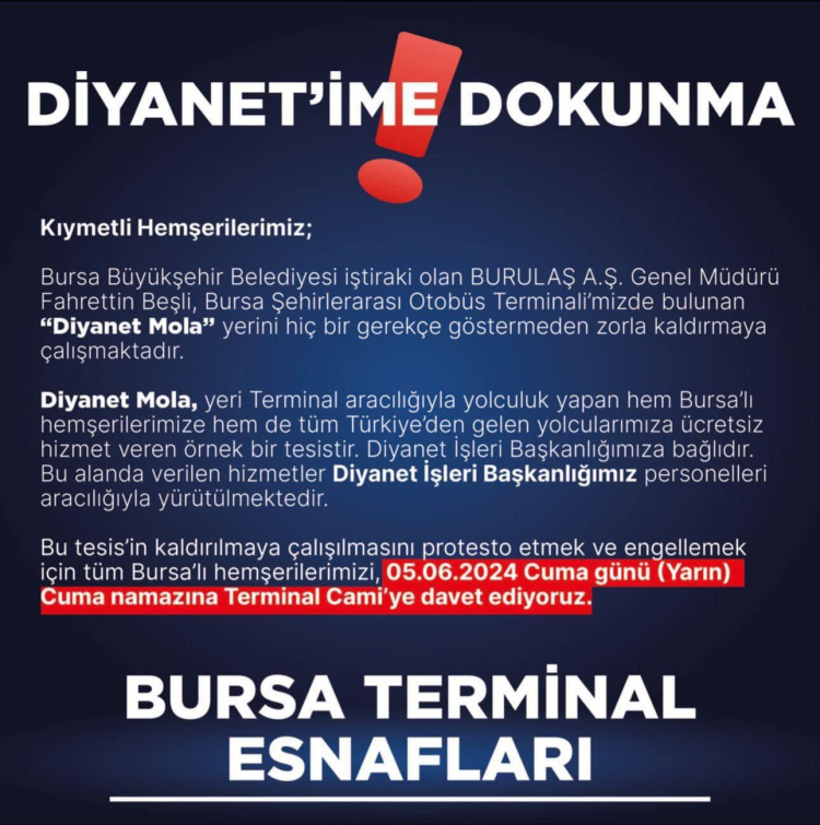 Bursa Şehirler Arası Otobüs Terminali esnafı söz konusu iddia sonrası bir bildiri yayınladı. “Diyanet’ime Dokunma” başlıklı bildiride platformun kaldırılmasına yönelik tepkilerini göstermek için Bursalıları bugün Cuma namazına Terminal Camii’ne davet etti.