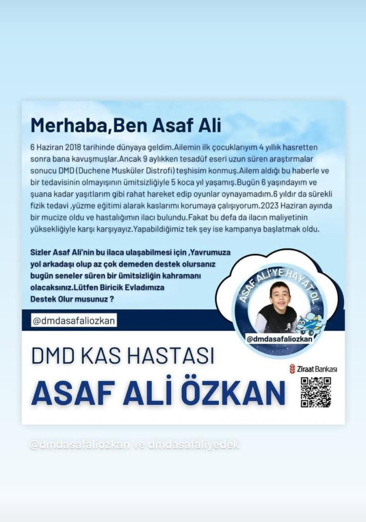 Asaf Ali Özkan’a henüz 9 aylıkken tesadüf eseri uzun araştırmalar sonucu DMD (Duchene Musküler Distrofi) konuldu. Şu an 6,5 yaşında olan Asaf Ali’nin iyileşebilmesi için ilacına kavuşması gerekiyor. Asaf Ali iyileşmek için vatandaşların desteklerini bekliyor.