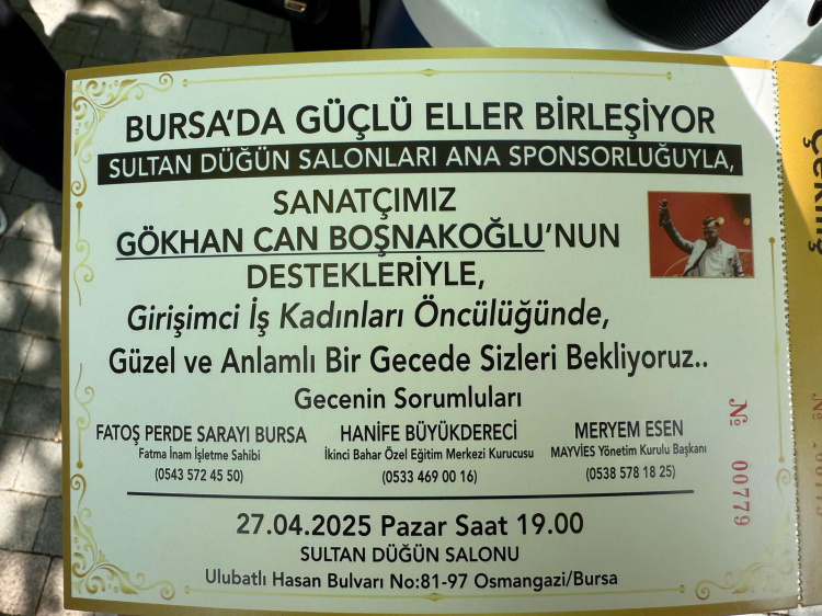 27 Nisan tarihinde saat 19.00’da Sultan Düğün Salonu’nda Asaf Ali Özkan için yapılan bağış gecesinde Sanatçı Gökhan Can Boşnak’ın sahne alacak. Bağışcı Fatoş Perde Sarayı hayırseverleri geceye davet etti: “Öncelikle Bursa halkı, çevre ilçelerden de bu geceye katılmanızı bekliyoruz. Her şey tamamen Asaf Ali için olacak. Onun ilacına katkısı için olacak. Çünkü miktarımız çok yüksek. Biz iş kadınları olarak iki aydır bunun için gece gündüz seferber yapıyoruz. Hassasiyeti gösteriyoruz. Burada bir anneye umut olmaya çalışıyoruz. Yüreği yaralı bir anneyi çocuğunun ilacına kavuşmasını sağlıyoruz. Valilik onayıyla belediyelerimizle birlikte bu gecemizi siz değerli insanlarımızın bekliyoruz.” şeklinde konuştu.
