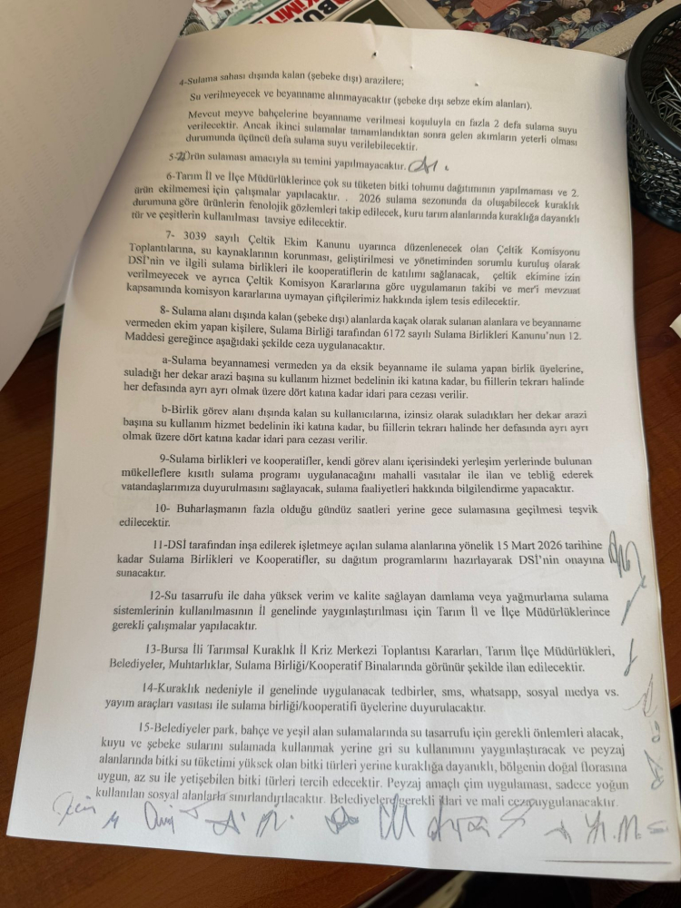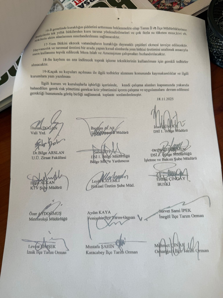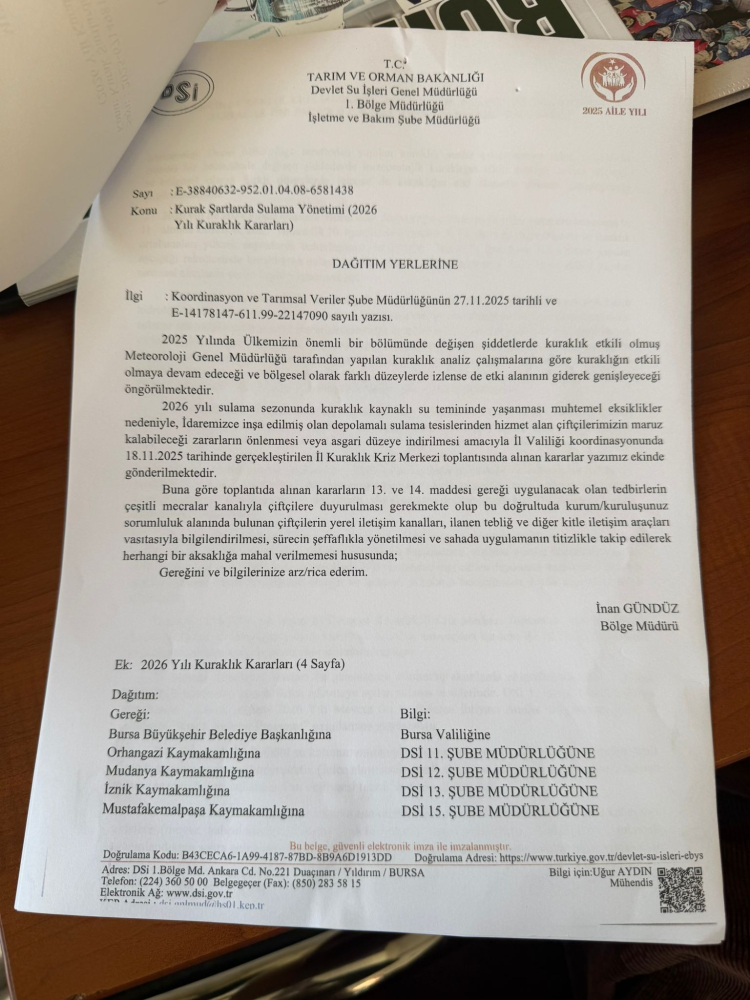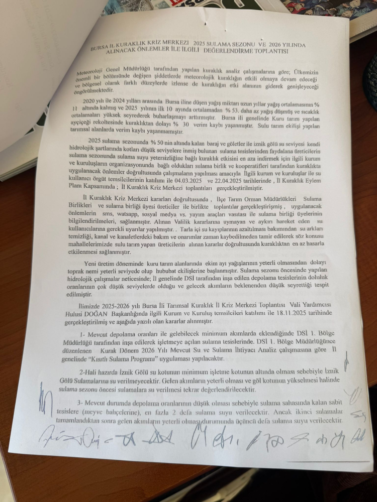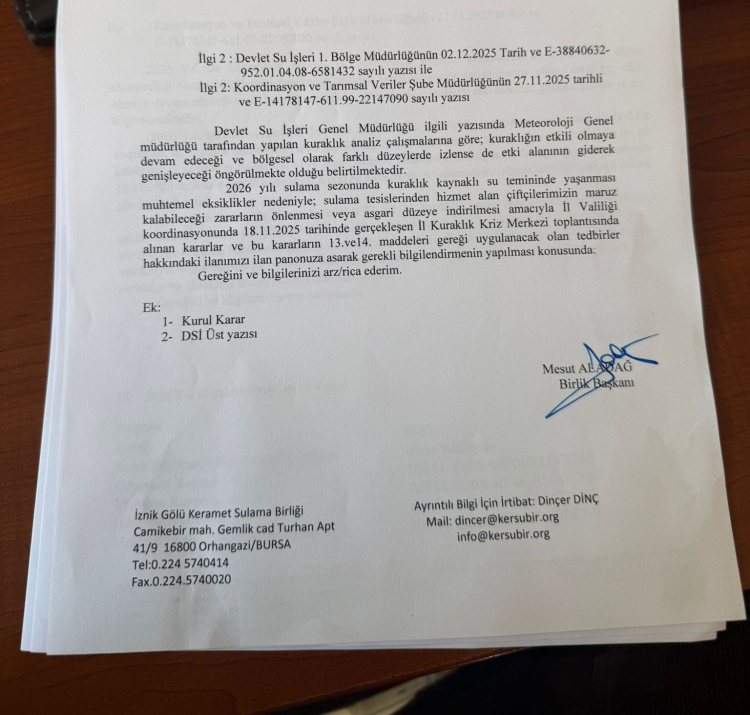 İznik Gölü Keramet Sulama Birliği tarafından Orhangazi muhtarlarına gönderilen yazıya göre, Bursa İl Kuraklık Kriz Merkezi ve Devlet Su İşleri (DSİ) 1. Bölge kararınca, 18 Kasım 2025 tarihinde yapılan İl Kuraklık Kriz Merkezi toplantısında alınan kararlarla göre; çiftçilere İznik Gölü’nden tarımsal sulamada kullanılmak amacıyla aktarılan su desteğinin kısıtlanacağı açıklandı.