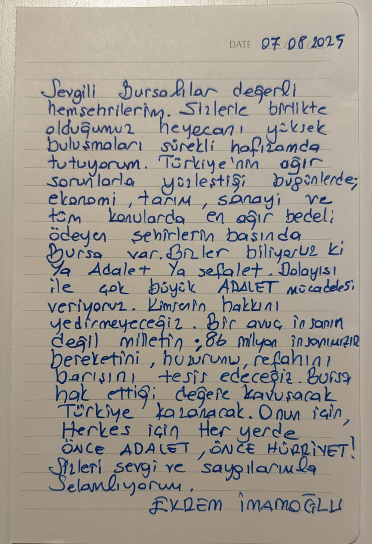 Paylaşımda Ekrem İmamoğlu'nun Bursalılar için yazdığı mektup yer aldı.