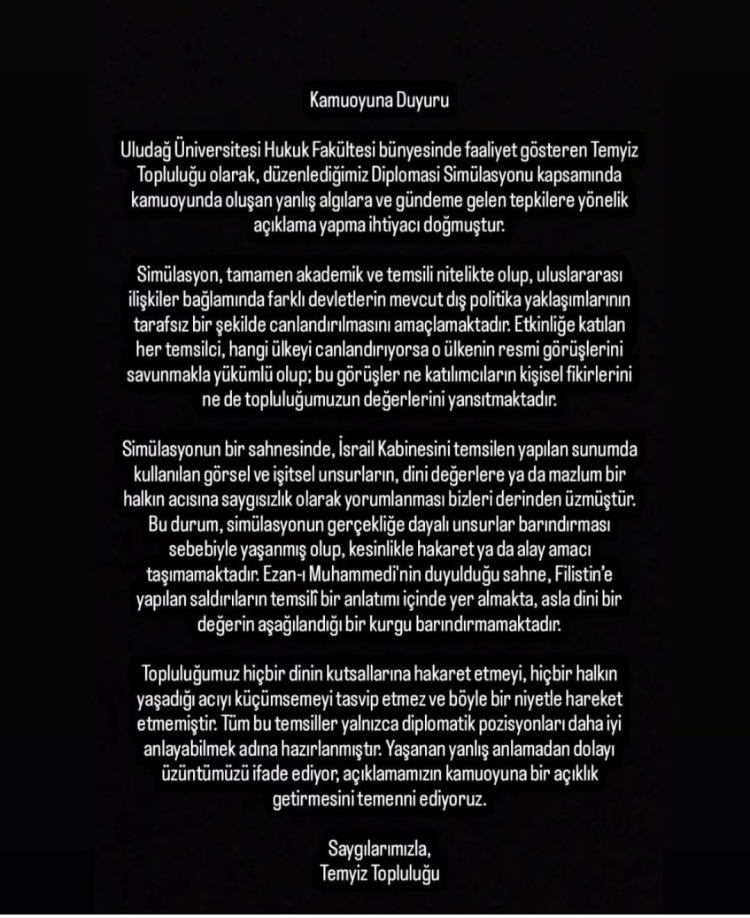 Bursa Uludağ Üniversitesi Hukuk Fakültesi Temyiz Topluluğu öğrencilerinin düzenlediği Diplomasi Simülasyonu programında İsrail'le ilgili sahnelenen bir canlandırmanın bağlamından koparıldığı bildirildi. AK Parti Bursa İl Gençlik Kolları Üniversiteler Birimi söz konusu görüntülere tepki gösterdi. Bursa Uludağ Üniversitesi Hukuk Fakültesi Temyiz Topluluğu ise tepki çeken program hakkında yapılan yayınlar hakkında hukuki adımlar atılacağını açıkladı.