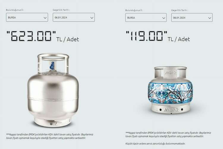 2024 yılının 6. gününde yapılan ikinci zam sonrası mutfak tüpünün fiyatı 623 TL'ye çıkarken piknik tüpünün fiyatı ise 119 TL oldu. Geçen senenin başında 328 TL'den satılan 12 kilogramlık mutfak tüpüne 2023'te 12 zam 1 kez indirim yapıldı.