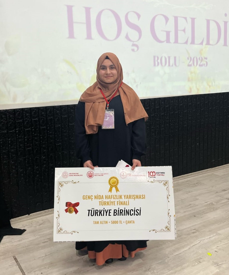 Bursa Kur'an Eğitim Merkezi ve Nizam Karasu İmam Hatip Lisesi öğrencisi Hafız Havva Amine Karakuş, Türkiye'deki 8 bölge birincisinin katıldığı 'Genç Nida Hafızlık Yarışması Türkiye Finali'nde birinci oldu.