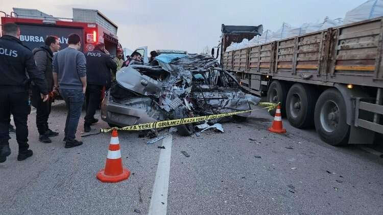 Bursa'da sürücüsünün kontrolünden çıkıp karşı şeride geçen otomobil, TIR'la çarpıştı. Kazada otomobilde sıkışan sürücü Havva Savaş (41) ile yengesi Sevim Savaş (53) hayatını kaybetti, TIR sürücüsü yaralandı.