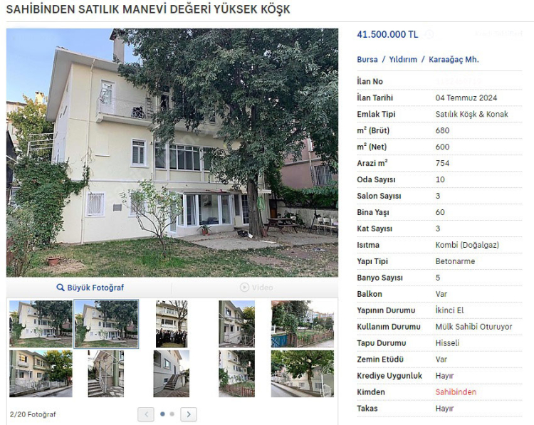 Daha önce 20 milyon TL'ye satışa sunulan eve bu kez 41 milyon 500 bin TL istendi.