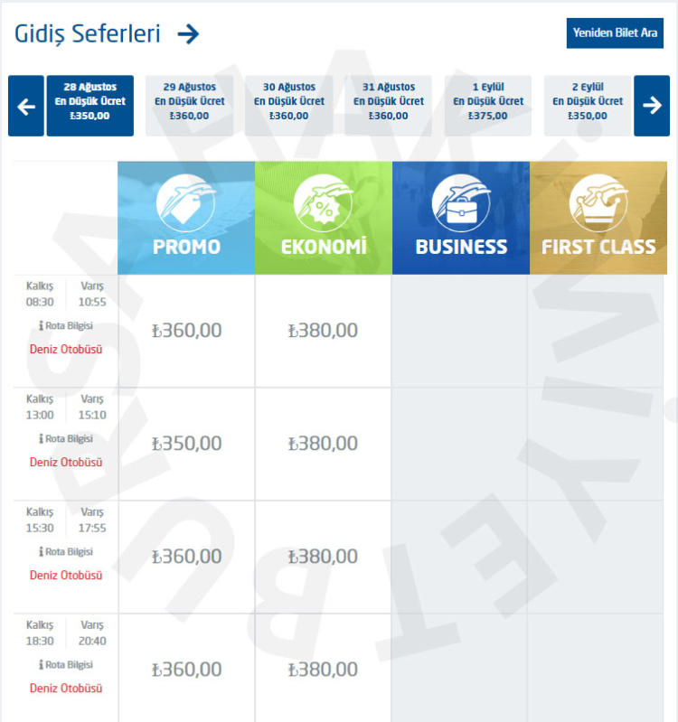 Haziran ayında 338 TL'den 348TL'ye çıkarılan en düşük ücretli promo biletin fiyatı 350 TL'ye yükselmiş oldu.