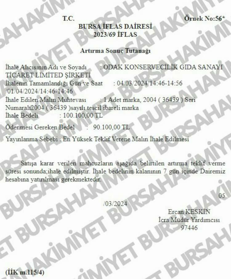 100 bin 100 TL'ye satılan marka hakkını İnegöl'de faaliyet gösteren Odak Konservecilik Gıda Sanayi Ticaret Limited Şirketi; 350 bin 300 TL'ye satılan marka hakkını ise Mehmet Ali Yüksel isimli vatandaş aldı.