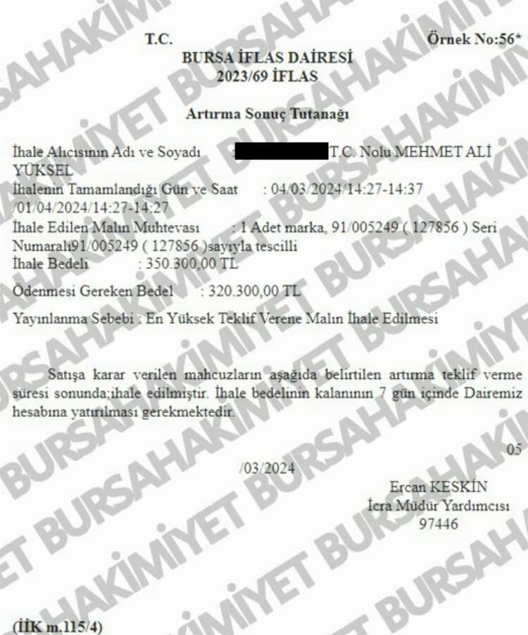Bursa İflas Dairesi, iflas eden firmaya ait marka haklarının satılacağını duyurmuştu. Bazı medya kuruluşları, ihalenin 2. artırmaya kaldığını ve 25 Mart'ta tamamlanacağını yazdı ancak 26 Şubat tarihinde başlayan ihale 4 Mart günü tamamlandı.
