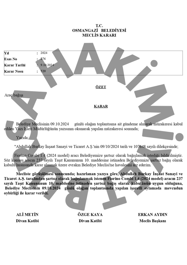 Bursa'da dev projelerde imzası bulunan Abdullah Burkay İnşaat Sanayi ve Ticaret Anonim Şirketi, Osmangazi Belediyesi'ne araç bağışında bulunmak için dilekçe verdi.