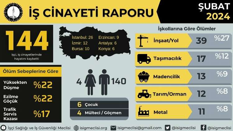 İşçi Sağlığı ve İş Güvenliği Meclisi'nin şubat ayı İş Cinayetleri Raporu'na göre, geçen ay 6'sı çocuk en az 144 işçi çalışırken hayatını kaybetti. Bursa'da ise