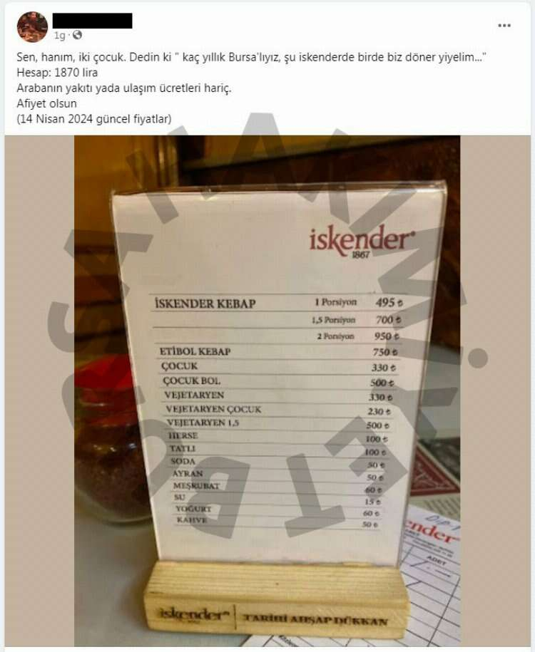 Vatandaş, zamlı menüyü, "Sen, hanım, iki çocuk. Dedin ki 'Kaç yıllık Bursalıyız, şu İskender'de bir de biz döner yiyelim...' Hesap: 1870 lira. Arabanın yakıtı ya da ulaşım ücretleri hariç. Afiyet olsun" notuyla paylaştı.