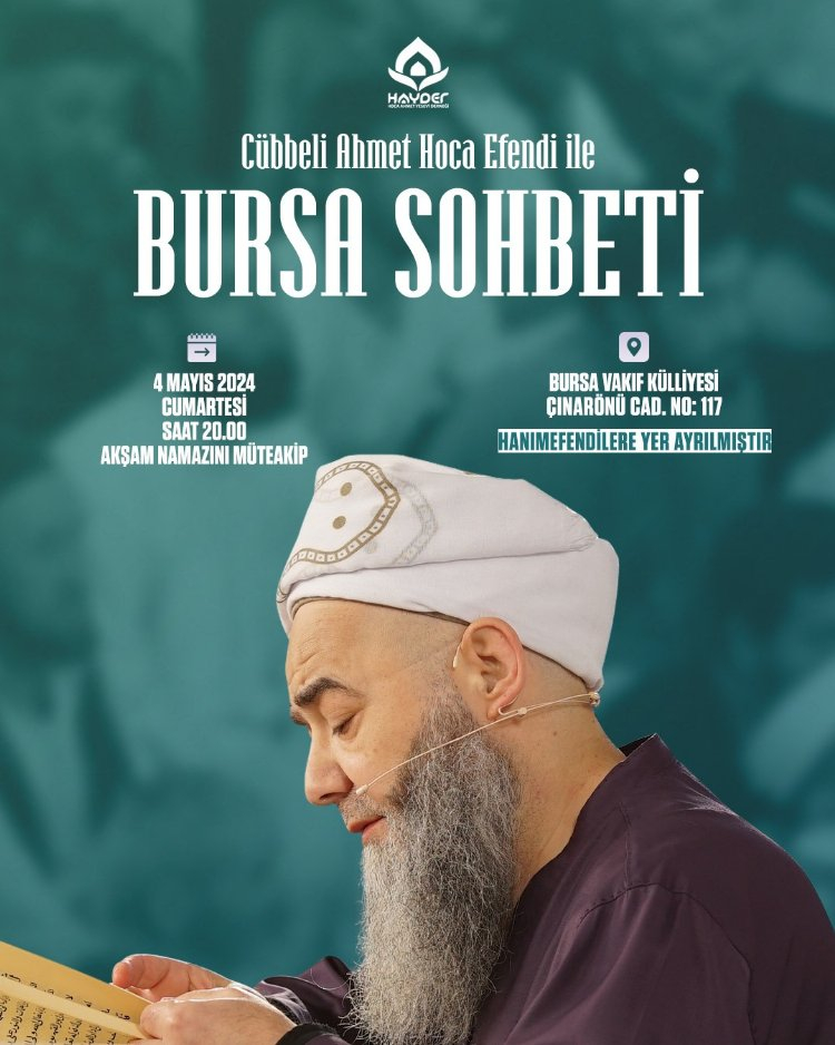 Akşam namazını müteakip saat 20.00'de HAYDER Bursa Vakıf Külliyesi'nde gerçekleşecek programda Cübbeli Hoca, vatandaşlara sohbet verecek.