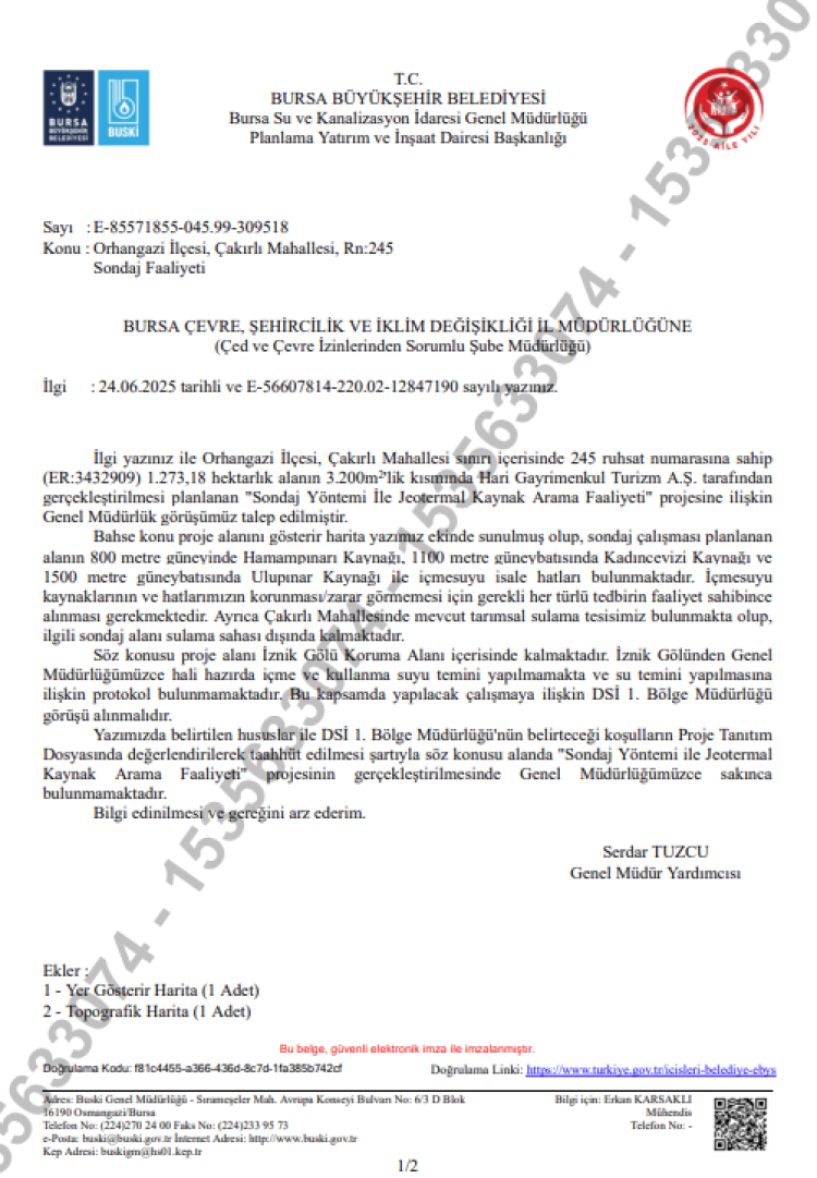 Yapılan resmi açıklamada, "İlimiz Orhangazi ilçesi Çakırlı mahallesi mevkiinde 245 ruhsat numaralı, ve 3432909 Erişim numaralı, 1.273,18 hektarlık ruhsatlı alanın 3.200 m2.lik alanda, Hari Gayrimenkul Turizm A.Ş. tarafından gerçekleştirilmesi planlanan “Sondaj Yöntemi İle Jeotermal Kaynak Arama Faaliyeti” projesi için,, 29.07.2022 tarih ve 31907 sayılı Resmi Gazetede yayımlanarak yürürlüğe giren Çevresel Etki Değerlendirmesi (ÇED) Yönetmeliğinin 16. maddesi uyarınca, Mers Çevre Mad. Müh. Dan. İş. Sağ. Güven. İnş. San. ve Tic. Ltd. Şti.’ye hazırlatılan Proje Tanıtım Dosyası, e_çed başvurusu ile Valiliğimize (Çevre, Şehircilik ve İklim Değişikliği İl Müdürlüğü) gönderilmiştir. ÇED Yönetmeliği'nin 17.maddesi gereğince, “Sondaj Yöntemi İle Jeotermal Kaynak Arama Faaliyeti”, projesine Valiliğimizce (Çevre, Şehircilik ve İklim Değişikliği İl Müdürlüğü) 29.09.2025 tarih ve E2025124 sayılı "Çevresel Etki Değerlendirmesi Olumlu" kararı verilmiştir. Kamuoyuna duyurulur." ifadeleri kullanıldı.