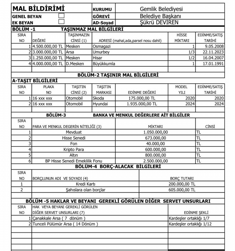 Gayrimenkul, otomobil, hisse senedi ve mevduat hesabı gibi çeşitli taşınmazların bulunduğu mal beyanı; edinim yılları ve o yılki edinim değerleri de içerisinde barındırırken, Gemlik Belediye Başkanı Şükrü Deviren tarafından 29 Nisan 2024 tarihinde imza altına alındı.