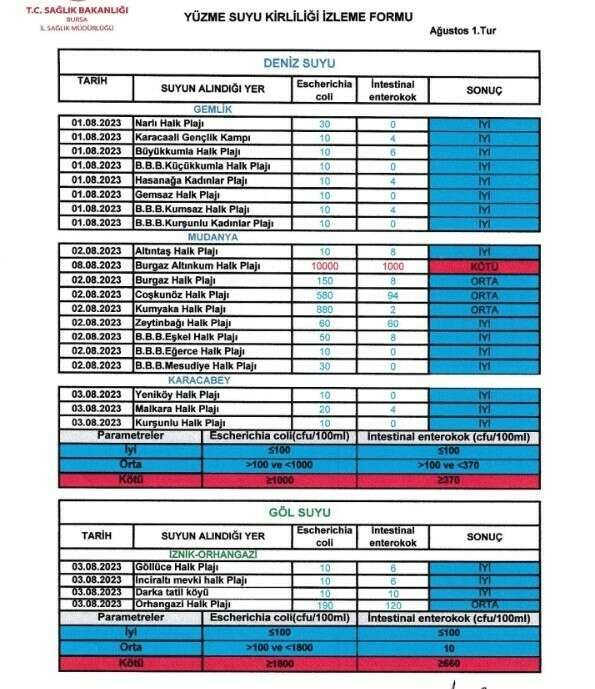 BURSA’NIN “İYİ, ORTA VE KÖTÜ” DENİZ SUYUNA SAHİP SAHİL VE PLAJLAR ŞÖYLE: